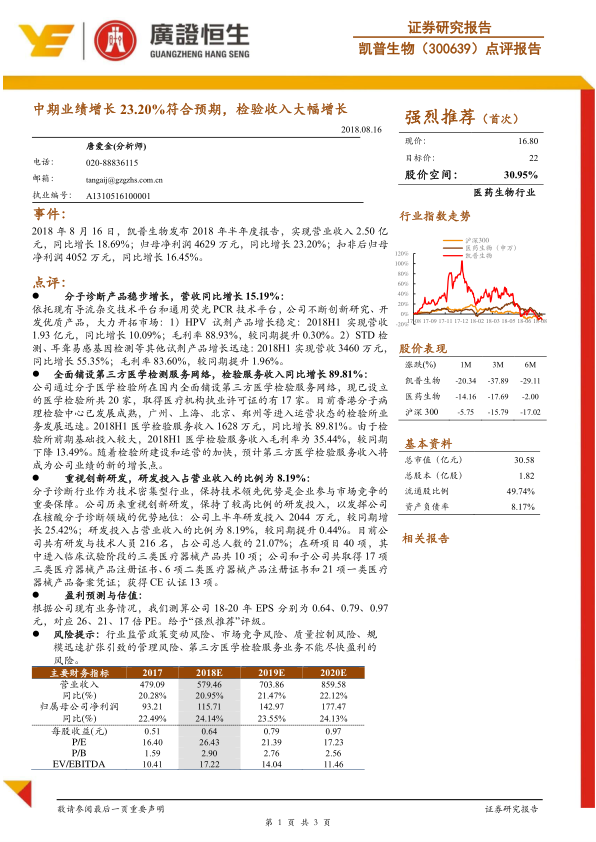 凯普生物于2018年8月16日发布半年度报告,数据显示公司上半年实现营业收入2.50亿元,同比增长18.69%;归属于母公司股东的净利润为4629万元,同比增长23.20%;扣除非经常性损益后的归母净利润为4052万元,同比增长16.45%。