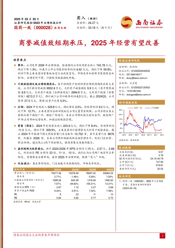 国药一致2024年业绩受商誉减值和零售业务下滑影响,短期承压。但公司分销业务在两广地区具有优势,零售药房也在全国范围内布局。预计随着公司加强内部管理、优化业务结构,2025年业绩有望迎来改善。维持“买入”评级,目标价33.18元,反映了对公司未来发展的信心。