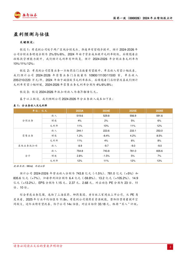 预计2024-2026年EPS分别为1.15元、2.37元、2.68元,对应动态PE分别为23倍、11倍、10倍。我们认为公司两广地区市占率领先,零售药房全国布局,看好2025年业绩回暖,维持“买入”评级。