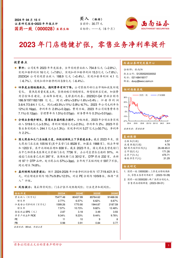 本报告对国药一致2023年年报进行了全面分析,公司整体业绩稳健增长,零售业务盈利能力显著提升,门店扩张和渠道创新是亮点。维持“买入”评级,但需关注潜在风险。报告详细分析了分销和零售业务的收入、利润及增长情况,并对未来几年的盈利情况进行了预测,为投资者提供了有价值的参考信息。