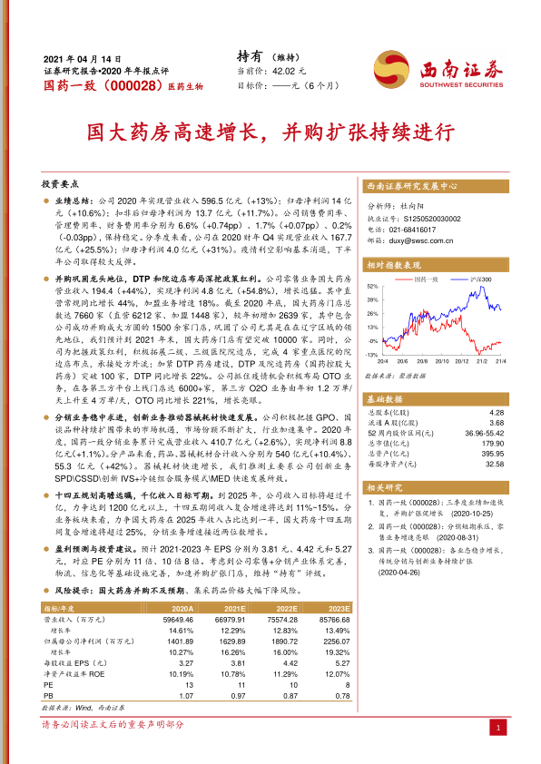 本报告全面分析了国药一致2020年年报,公司在疫情影响下依然实现了稳健增长,零售业务高速扩张,分销业务稳中求进,创新业务驱动增长。公司制定的十四五规划目标明确,未来发展可期。考虑到公司完善的产业体系和基础设施,维持“持有”评级,但需关注国大药房并购不及预期和集采药品价格大幅下降等风险。