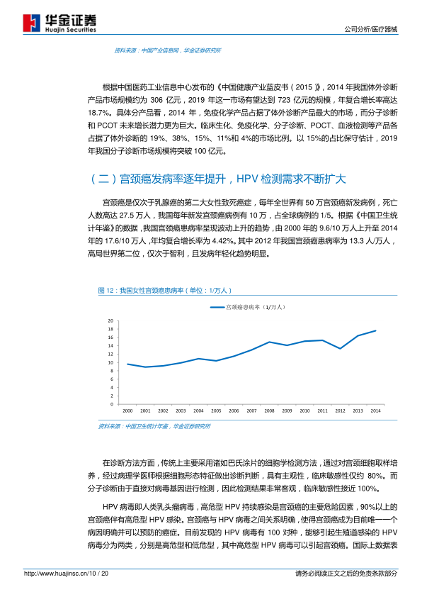 2016年7月,GSK的HPV2价疫苗希瑞适®获得中国食品药品监督管理总局(CFDA)的上市许可,成为国内首个获批的预防宫颈癌的HPV疫苗,在中国注册用于9~25岁女性的接种,预计在2017年初正式上市。HPV疫苗的获批极大地提升了我国人民对宫颈癌以及HPV病毒的关注度,越来越多的人开始重视宫颈癌的预防,并逐渐了解到HPV病毒与宫颈癌之间的重要关系。我们认为,随着HPV疫苗的获批上市,市场培育将进一步展开,人们对HPV病毒的认知加深也将使人们更加理解HPV检测的重要性,从而逐步打开HPV检测的市场空间。