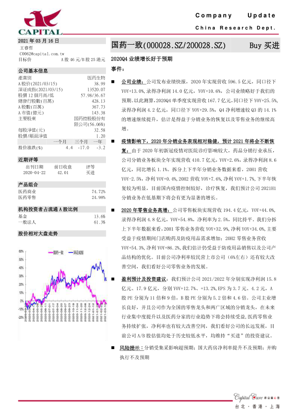 本报告分析了国药一致2020年的业绩表现,特别是Q4季度业绩的超预期增长,并深入探讨了分销和零售业务的发展情况。报告认为,公司作为医药零售和分销领域的龙头企业,具备长期发展的潜力,并维持“买进”的投资建议。同时,报告也提示了可能存在的风险,如集采政策的影响、净利率提升不及预期以及并购执行的风险。