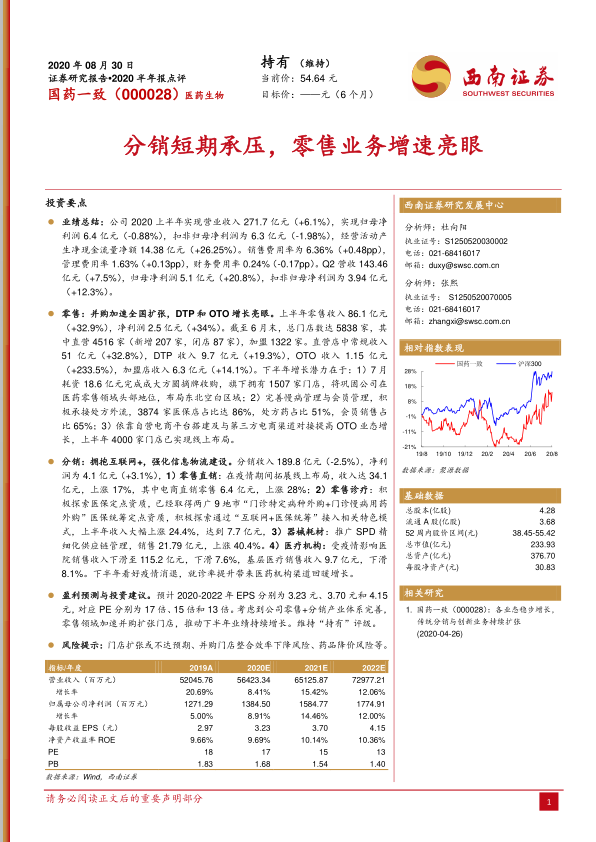 预计2020-2022年EPS分别为3.23元、3.70元和4.15元,对应PE分别为17倍、15倍和13倍。考虑到公司零售+分销产业体系完善,零售领域加速并购扩张门店,推动下半年业绩持续增长,维持“持有”评级。
