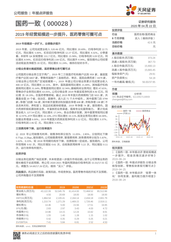 国药一致2019年经营规模进一步提升,业绩稳步增长,分销业务在两广地区保持领先地位,医药零售业务通过门店扩张和创新业务拓展实现快速发展。公司费用控制和运营效率有所提升。维持“买入”评级,但需关注药品降价、政策变动、市场竞争以及并购整合等风险。