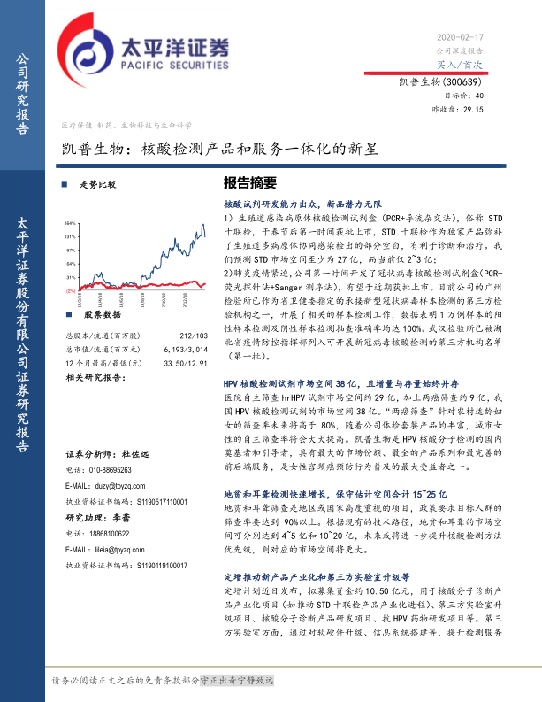 - 投资评级: 凯普生物2019-2021年业绩高增长且确定性较强,产品线丰富,HPV检测保持较快增长,二线产品放量,有望逐步成为核酸分子检验龙头。预计2019-2021年PE分别为42/32/25。首次覆盖,给予“买入”评级。