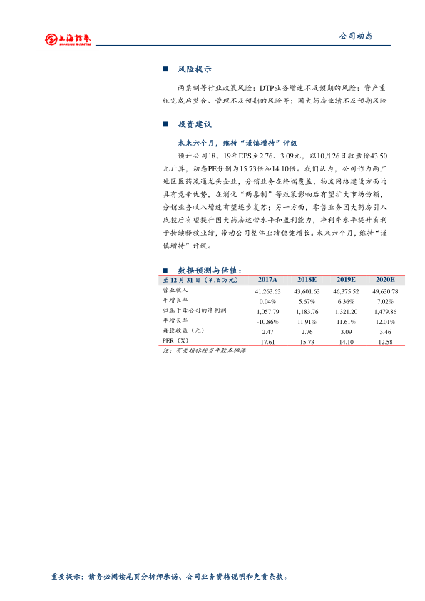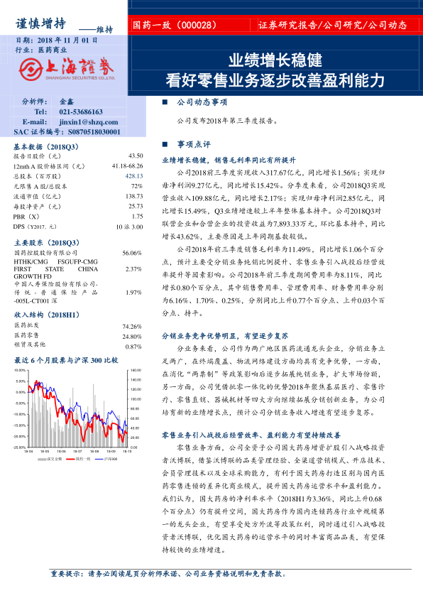 本报告对国药一致(000028)2018年第三季度报告进行了分析,认为公司业绩增长稳健,销售毛利率有所提升。分销业务有望逐步复苏,零售业务引入战投后经营效率和盈利能力有望持续改善。维持“谨慎增持”评级,并提示了相关风险。报告还提供了详细的财务数据预测,为投资者提供参考。