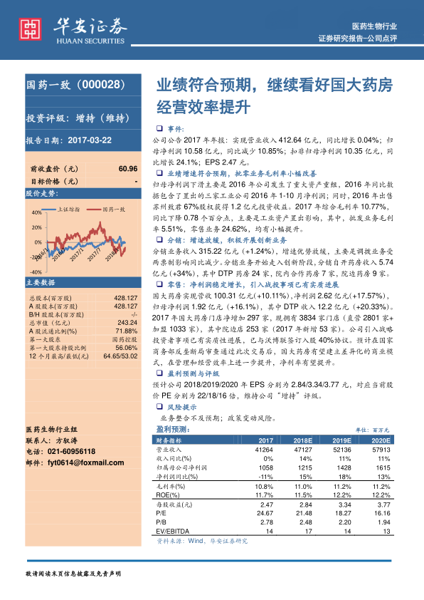本报告分析了国药一致2017年年报,指出公司业绩符合预期,经营效率有所提升。分销业务增速放缓,但积极开展创新业务。国大药房营收和净利润稳定增长,引入战投后发展前景广阔。维持公司“增持”评级,并提示了业务整合不及预期和政策变动风险。