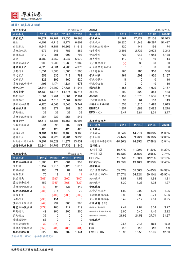 预计公司2018/2019/2020年EPS分别为2.84/3.34/3.77元,对应当前股价PE分别为22/18/16倍,维持公司“增持”评级。