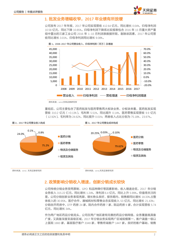 本报告分析了国药一致2017年年报,指出公司在经历资产重组后,虽然整体业绩增速放缓,但剔除重组因素后仍保持稳健增长。传统分销业务受到政策影响,但创新分销业务表现亮眼,成为新的增长动力。国大药房的并入为公司零售业务注入了活力,通过多元化的零售业态发展和门店数量质量的提升,实现了收入和利润的双增长。公司在两广地区的分销龙头地位稳固,国大药房作为全国销售规模最大的零售药店,未来发展潜力巨大。