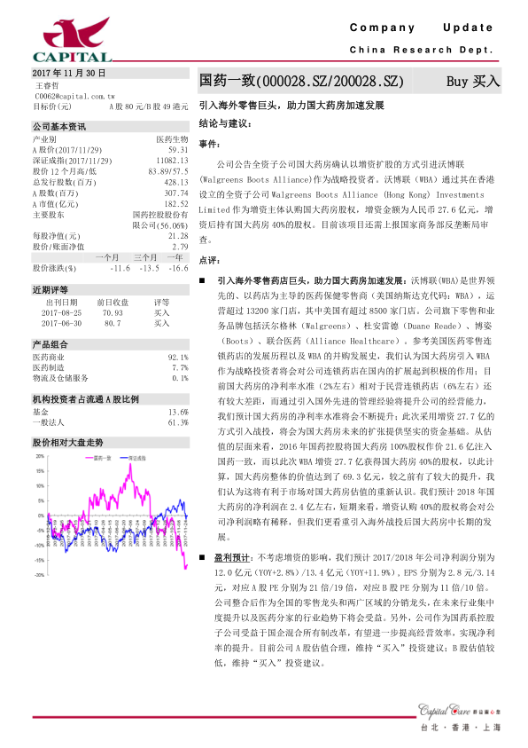 维持对国药一致A股和B股的“买入”投资建议。理由是公司作为全国零售龙头和两广区域分销龙头,将受益于行业集中度提升和医药分家的趋势。同时,受益于国企混合所有制改革,公司有望进一步提高经营效率,实现净利率的提升。