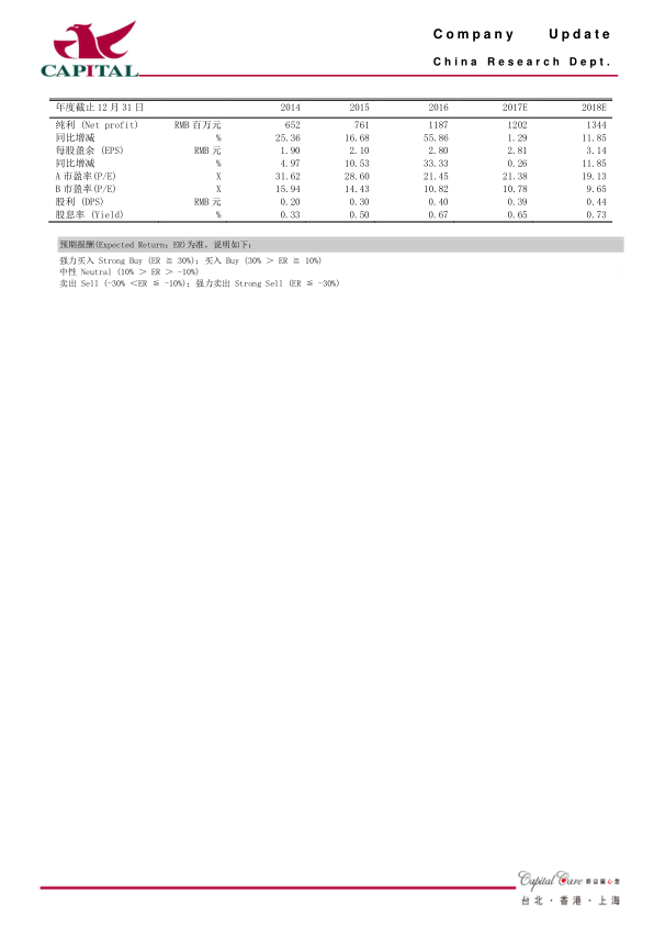 不考虑增资的影响,预计2017/2018年公司净利润分别为12.0亿元(YOY+2.8%)/13.4亿元(YOY+11.9%), EPS分别为2.8元/3.14元,对应A股PE分别为21倍/19倍,对应B股PE分别为11倍/10倍。