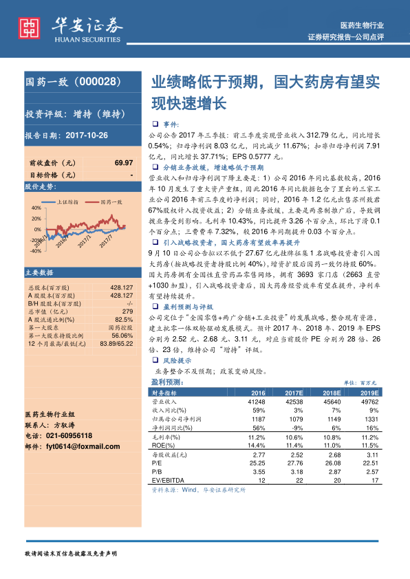 公司坚定“全国零售+两广分销+工业投资”的发展战略,致力于构建批零一体化的双轮驱动模式。国大药房引入战略投资者后,其全国性直营药品零售网络(拥有3693家门店)有望实现效率再提升,净利率持续改善。分析师维持“增持”评级,预计未来三年(2017-2019年)EPS将持续增长,显示出对公司长期发展战略和国大药房增长潜力的信心。