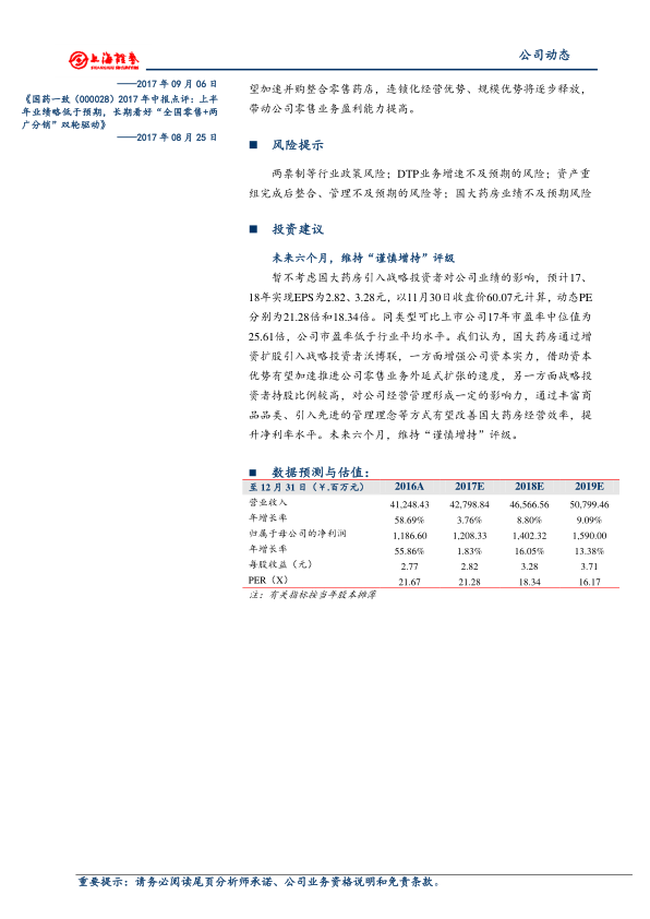 报告提示了多项潜在风险,包括“两票制”等行业政策变化带来的风险;DTP(直接面向患者)业务增速可能不及预期的风险;资产重组完成后,整合与管理效果可能不及预期的风险;以及国大药房未来业绩表现可能不及预期的风险。