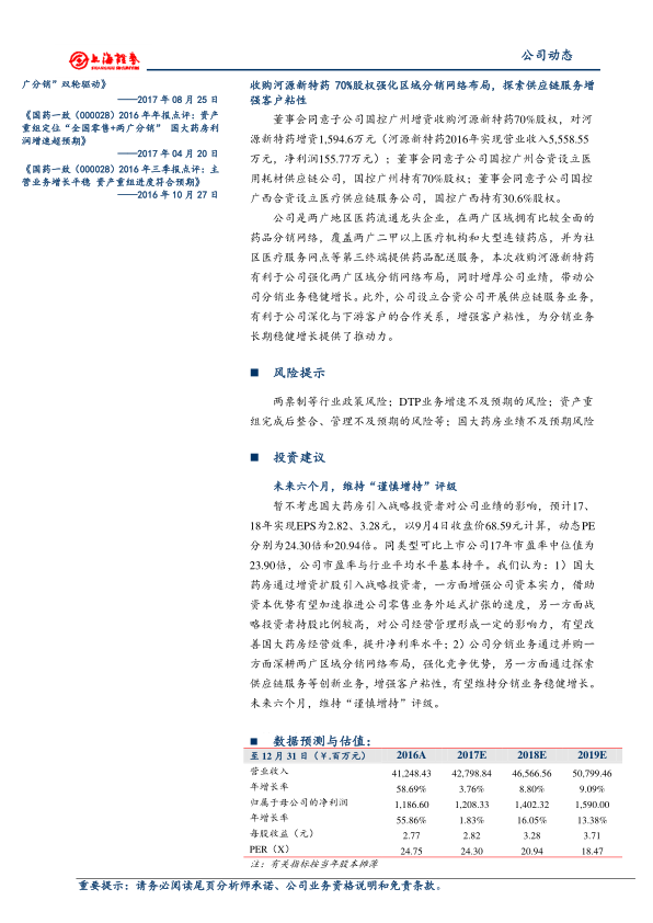 报告提示了以下风险:两票制等行业政策风险、DTP业务增速不及预期的风险、资产重组完成后整合管理不及预期的风险以及国大药房业绩不及预期风险。