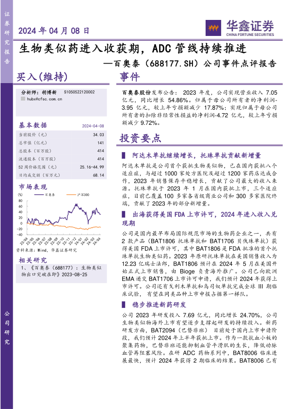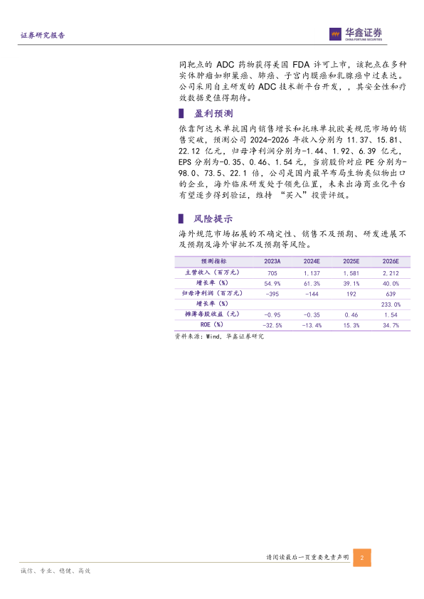 依靠阿达木单抗国内销售增长和托珠单抗欧美规范市场的销售突破,预测公司2024-2026年收入分别为11.37、15.81、22.12亿元,归母净利润分别为-1.44、1.92、6.39亿元,EPS分别为-0.35、0.46、1.54元,当前股价对应PE分别为-98.0、73.5、22.1倍,公司是国内最早布局生物类似物出口的企业,海外临床研发处于领先位置,未来出海商业化平台有望逐步得到验证,维持“买入”投资评级。