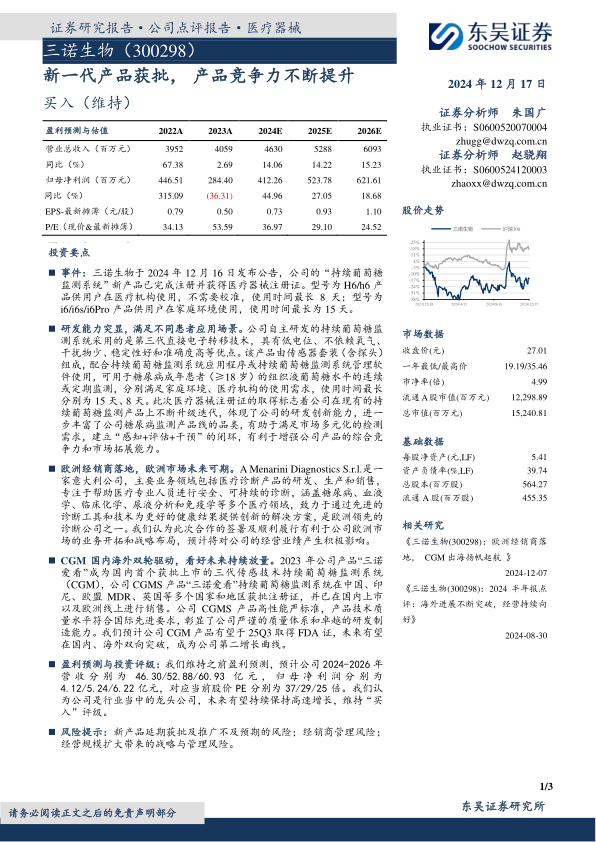 事件:三诺生物于2024年12月16日发布公告,公司的“持续葡萄糖监测系统”新产品已完成注册并获得医疗器械注册证。型号为H6/h6产品供用户在医疗机构使用,不需要校准,使用时间最长8天;型号为i6/i6s/i6Pro产品供用户在家庭环境使用,使用时间最长为15天。