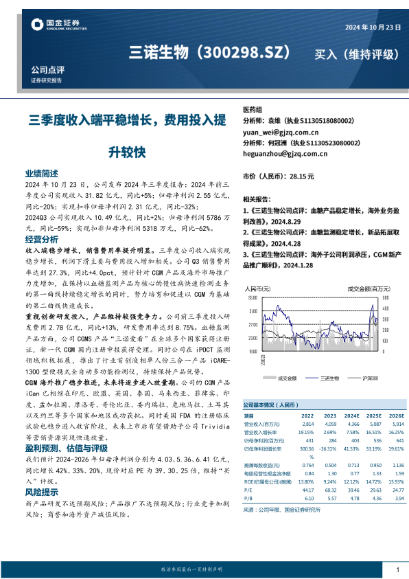 本报告分析了三诺生物2024年三季度业绩,指出公司在收入端保持稳步增长的同时,利润受到销售费用增加的影响。公司重视研发投入,CGM产品海外推广稳步推进,未来有望进入放量期。维持“买入”评级,但需关注相关风险。
