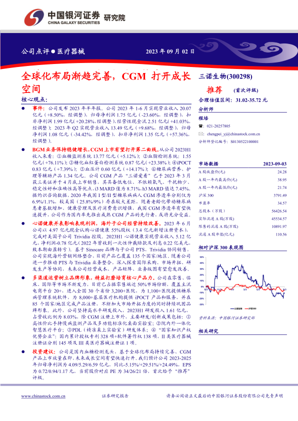 投资建议: 公司是国内血糖检测龙头,基于全球化布局持续完善、 CGM产品上市放量在即,未来成长空间有望快速打开。 我们预计公司 2023-2025年归母净利润为 4.09/5.29/6.59 亿元,同比-5.15%/+29.51%/+24.49%, EPS为 0.72/0.94/1.17 元,当前股价对应 PE 为 34/26/21 倍, 首次给予“推荐”评级。