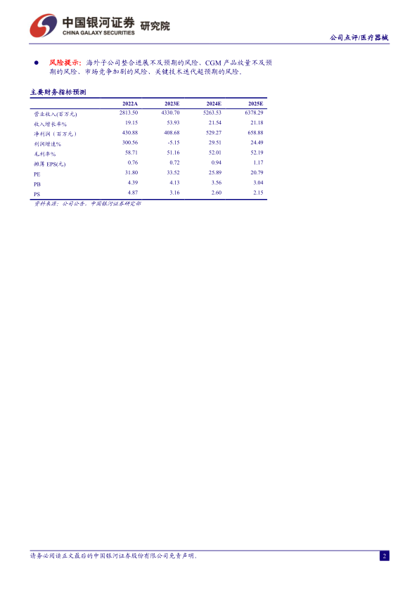风险提示: 海外子公司整合进展不及预期的风险、 CGM 产品放量不及预期的风险、 市场竞争加剧的风险、 关键技术迭代超预期的风险