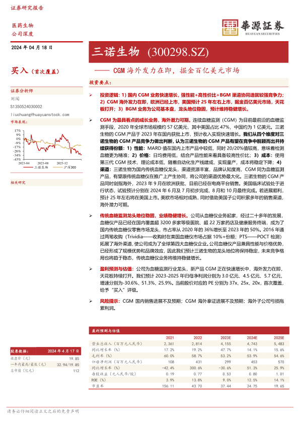 盈利预测与估值:公司为血糖监测行业龙头,新产品CGM正在快速增长中,海外发力在即,天花板持续打开。我们预计2023-2025年归母净利润分别为3.0亿元、4.5亿元、5.7亿元,增速分别为-30.6%、51.3%、25.9%。当前股价对应的PE分别为37x、25x、20x,首次覆盖,给予“买入”评级。