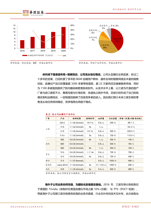 龙头地位稳固 以三诺生物为代表的国产厂家在技术水平上已与进口品牌差距不大,并凭借性能与价格优势,快速抢占院外市场。公司已形成了显著的规模优势和品牌效应,有效构筑了行业壁垒,阻碍了后续竞争者的进入。因此,报告预计三诺生物在零售市场的龙头地位将保持稳定,竞争格局趋于稳态,传统血糖仪业务将维持稳健增长。
