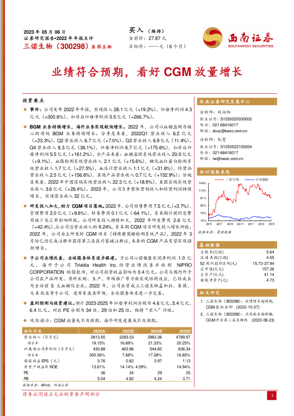 本报告对三诺生物2022年年报进行了全面分析,公司业绩符合预期,传统BGM业务稳健增长,海外市场拓展迅速。尤其看好公司在CGM领域的布局,认为其有望成为公司未来业绩增长的重要驱动力。公司持续加大研发投入,积极拓展全球市场,进一步巩固了其行业地位。维持“买入”评级,但需关注CGM放量和海外研发进展不及预期的风险。