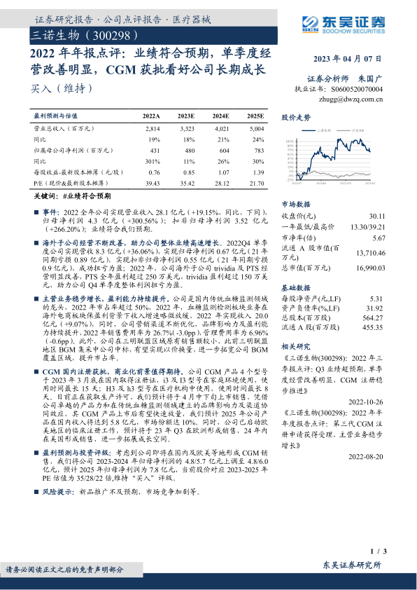 考虑到公司即将在国内及欧美等地形成CGM销售,将公司2023-2024年归母净利润上调至4.8/6.0亿元,预计2025年归母净利润为7.8亿元,当前股价对应2023-2025年PE估值为35/28/22倍,维持“买入”评级。