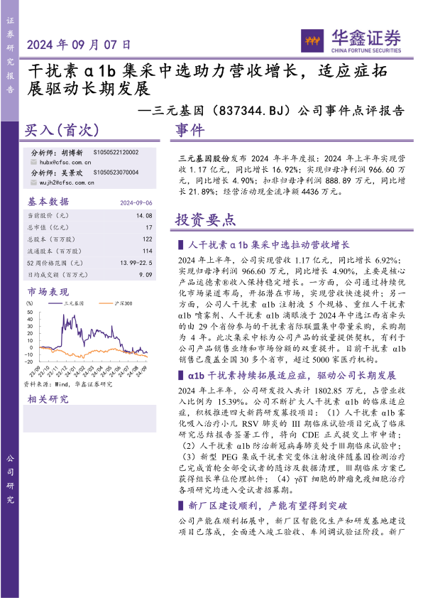 三元基因在2024年上半年展现出稳健的业绩增长,核心驱动力在于人干扰素α1b产品成功中选省际联盟集采,显著扩大了市场覆盖和销售规模。公司持续高强度的研发投入,积极推进多项人干扰素α1b适应症的拓展和新药研发项目,为未来的长期发展注入了强大动力。同时,新厂区建设的顺利完成将大幅提升公司产能,为业绩增长提供坚实保障。综合来看,公司未来业绩增长潜力较大,华鑫证券首次覆盖并给予“买入”评级,但投资者仍需警惕产品推广、市场竞争、研发进度及政策变化等潜在风险。