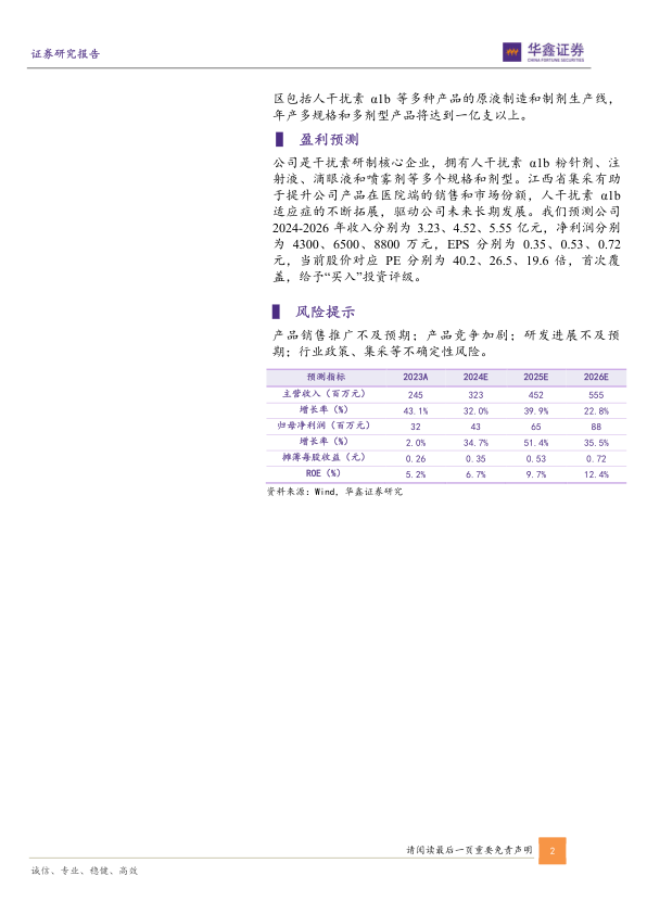 公司是干扰素研制核心企业,拥有人干扰素α1b粉针剂、注射液、滴眼液和喷雾剂等多个规格和剂型。江西省集采有助于提升公司产品在医院端的销售和市场份额,人干扰素α1b适应症的不断拓展,驱动公司未来长期发展。我们预测公司2024-2026年收入分别为3.23、4.52、5.55亿元,净利润分别为4300、6500、8800万元,EPS分别为0.35、0.53、0.72元,当前股价对应PE分别为40.2、26.5、19.6倍,首次覆盖,给予“买入”投资评级。