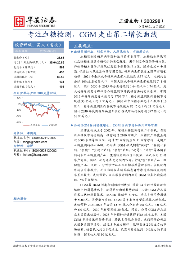本报告核心观点指出,全球及中国糖尿病患者基数庞大且持续增长,为血糖监测市场提供了巨大的刚性需求和发展潜力。三诺生物作为国内血糖监测领域的领军企业,凭借其在传统血糖仪(BGM)市场的稳固地位和持续增长,以及在连续血糖监测(CGM)领域的创新突破和国内外市场拓展,有望走出第二增长曲线。公司通过海外子公司整合实现多指标检测,并逐步改善盈利能力,未来业绩增长可期。