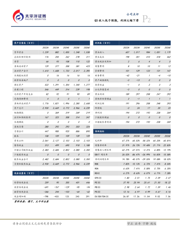 Q3收入低于预期,利润大幅下滑。单季度来看,2024Q3实现营业收入1.96亿元,同比下降32.26%,归母净利润为745万元,同比下降90.92%,扣非后归母净利润为180万元,同比下降97.79%。我们判断,2024Q3收入端增速低于预期大概率和临床前药学研究业务表现欠佳有关,此前降价的订单陆续体现在报表端;此外,我们判断利润端大幅下滑原因是在收入下滑的同时成本无法下降(如人力成本、医院费用等)。
