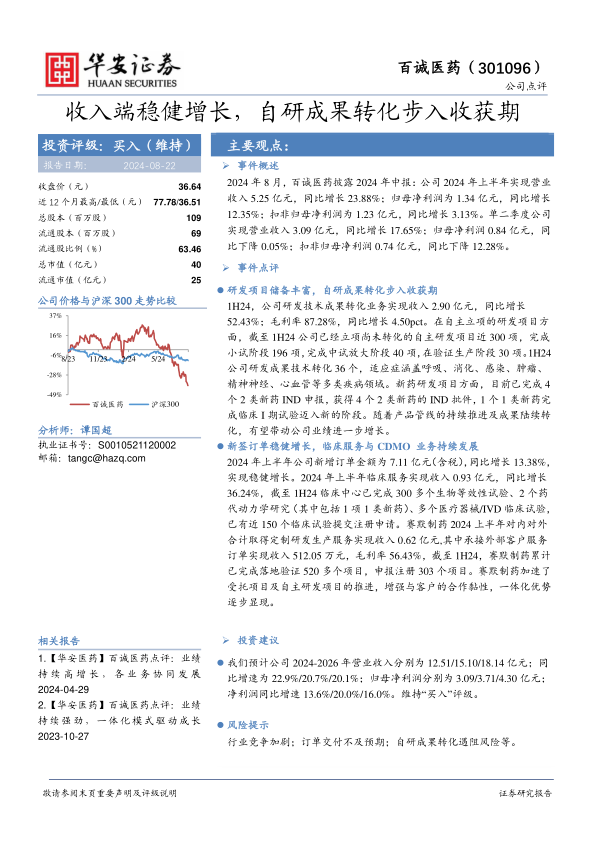 百诚医药2024年中报显示,公司在收入端保持稳健增长,自研成果转化进入收获期,新签订单稳健增长,临床服务与CDMO业务持续发展。华安证券维持“买入”评级,并对公司未来几年的营收和利润增长持乐观态度。
