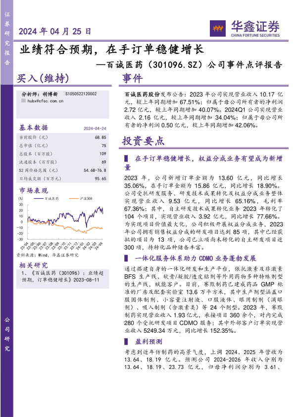 百诚医药在2023年及2024年第一季度展现出强劲的业绩增长,营业收入和归母净利润均实现大幅提升,符合市场预期。公司在手订单稳健增长,为未来业绩提供了坚实保障。权益分成业务和一体化CDMO服务体系是公司重要的增长引擎,特别是CDMO外部客户订单收入的显著增长,凸显了其市场竞争力。基于仿制药的高景气度,分析师上调了公司的盈利预测并维持“买入”评级,但同时提示了政策变动、行业竞争加剧以及订单转化不及预期等潜在风险,建议投资者关注。