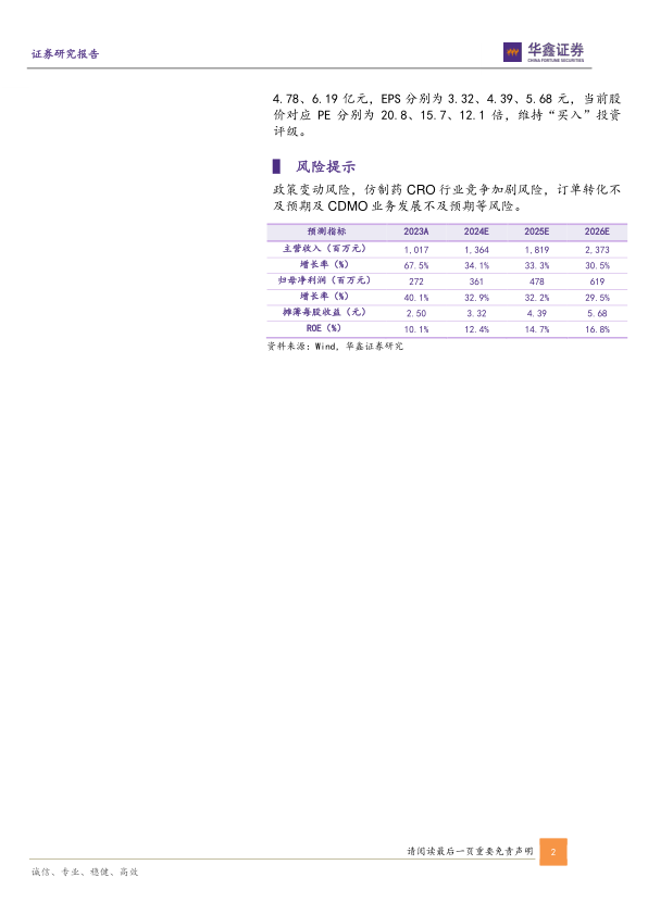 政策变动风险,仿制药CRO行业竞争加剧风险,订单转化不及预期及CDMO业务发展不及预期等风险。