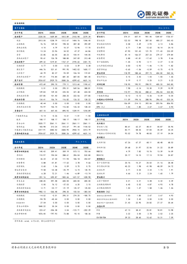 营业成本上:2023Q1-Q3公司营业成本为2.3亿(+83.4%),快于收入增速,毛利率为67.3%,同比下滑2.4pct。从费用端看:公司2023Q1-Q3销售费用率9.5‰,继续收窄;管理费用率13.9%,同比有所收窄,绝对值同比增长67.0%,主要系2022年度6月授予的股权激励费用摊销所致;研发费用投入维持高水平,研发费用率达到21.6%,但绝对值同比增长35.5%。