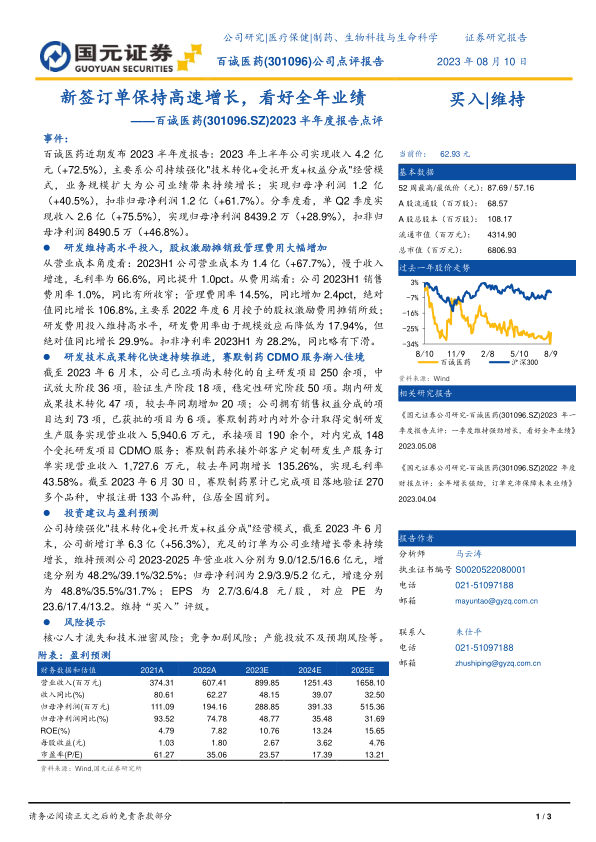 百诚医药凭借其独特的经营模式和强大的研发能力,在2023年上半年取得了显著的业绩增长。公司持续推进技术转化,CDMO服务渐入佳境,新增订单充足,为未来业绩增长奠定了坚实基础。国元证券维持对公司的“买入”评级,并预测公司未来几年将保持高速增长。然而,投资者也应关注核心人才流失、竞争加剧以及产能投放不及预期等风险。