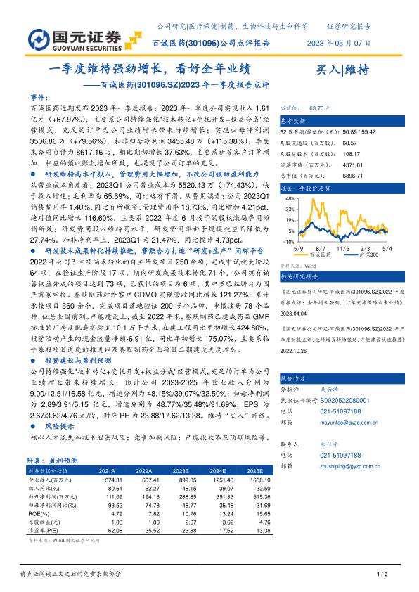 百诚医药2023年一季度业绩表现亮眼,营收和利润均实现大幅增长,盈利能力稳健。公司通过“技术转化+受托开发+权益分成”的经营模式,以及与赛默制药的合作,不断提升研发实力和产能水平。维持对公司未来发展的乐观预期,维持“买入”评级。