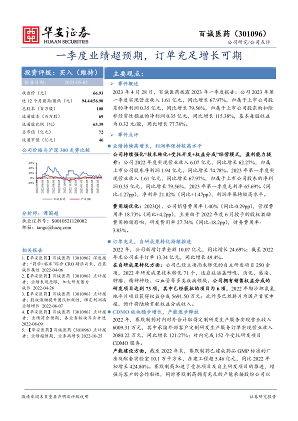 公司持续强化“技术转化+受托开发+权益分成”经营模式,盈利能力提升:公司2022年度实现营业收入6.07亿元,同比增长62.27%,归属上市公司股东净利润1.94亿元,同比增长74.78%。2023年第一季度实现营业收入1.61亿元,同比增长67.97%,归属于上市公司股东的净利润0.35亿元,同比增长79.56%,2023年第一季度毛利率65.69%(同比-1.27pp),净利率21.82%(同比+1.47pp),利润率保持较高水平。费用端优化:2023Q1,公司销售费用率1.40%(同比-0.29pp),管理费用率18.73%(同比+4.2pp),主要由于2022年度6月授予的股权激励费用摊销影响,研发费用率27.74%(同比-18.2pp),财务费用率-3.83%。