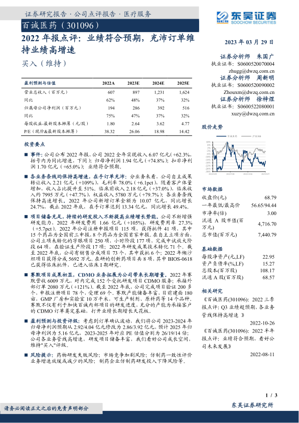 百诚医药在2022年取得了符合预期的优异业绩,营业总收入和归母净利润均实现高速增长,展现出强劲的盈利能力和市场竞争力。公司核心业务全面开花,自主成果转让、临床前、临床及权益收入均保持高增速,且在手订单充沛,为未来业绩的持续增长提供了坚实保障。通过持续高强度的研发投入,公司不断提升创新能力,积累了丰富的项目储备,包括大量的注册申报项目、自主立项项目以及销售分成项目,为公司的长期发展注入了强大动力。此外,赛默CDMO业务的成功拓展,不仅优化了内部研发效率,更凭借其强大的产能储备,为公司开辟了新的长期增长点,有效打开了未来的成长天花板。综合来看,尽管短期盈利预测略有调整,但百诚医药展现出良好的成长性和发展潜力,其长期投资价值依然显著,东吴证券维持“买入”评级。
