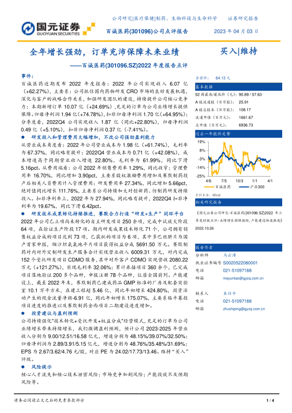 百诚医药近期发布2022年度报告:2022年公司实现收入6.07亿(+62.27%),主要系:公司抓住国内药物研发CRO市场的良好发展机遇,深化与客户的战略合作关系,加强研发团队的建设,持续提升公司核心竞争力;本期新增订单10.07亿(+24.69%),充足的订单为公司业绩增长提供保障。归母净利润1.94亿(+74.78%),扣非归母净利润1.70亿(+64.95%);分季度看,2022Q4公司实现收入1.87亿(同比+22.80%),归母净利润0.49亿(+5.10%),扣非归母净利润0.37亿(-7.41%)。