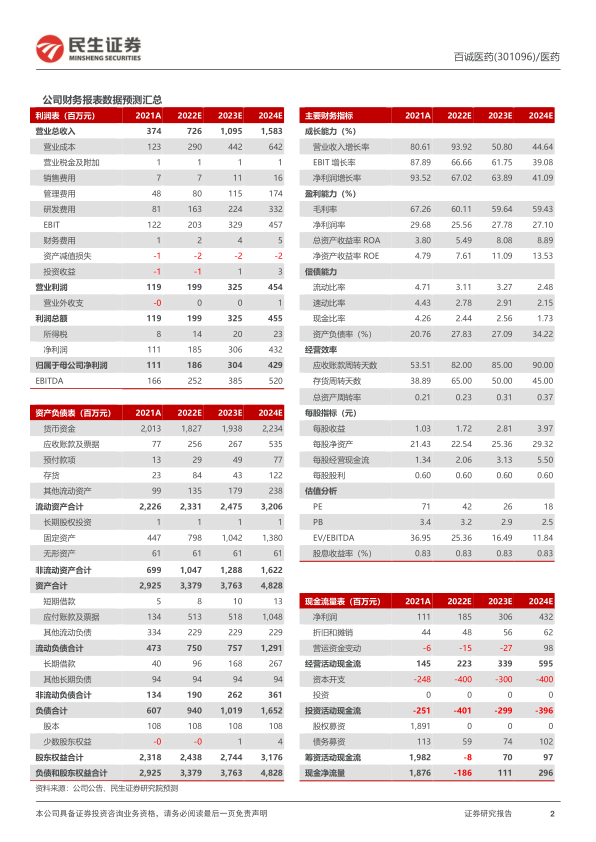 根据民生证券研究院的预测数据,百诚医药在未来几年将保持高速增长。