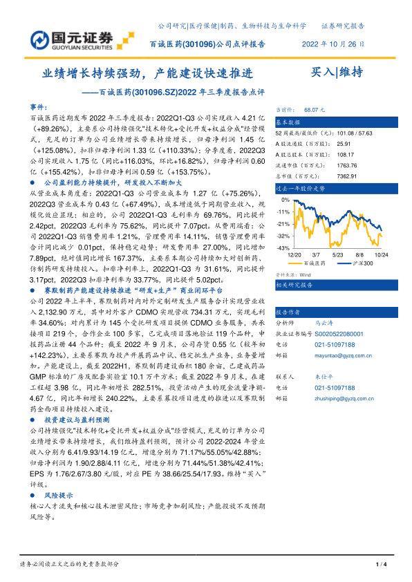 百诚医药2022年三季度业绩表现强劲,盈利能力持续提升,赛默制药产能建设快速推进,为公司未来发展奠定了坚实基础。维持对公司未来盈利的乐观预测,并维持“买入”评级。但同时也需关注相关风险因素。