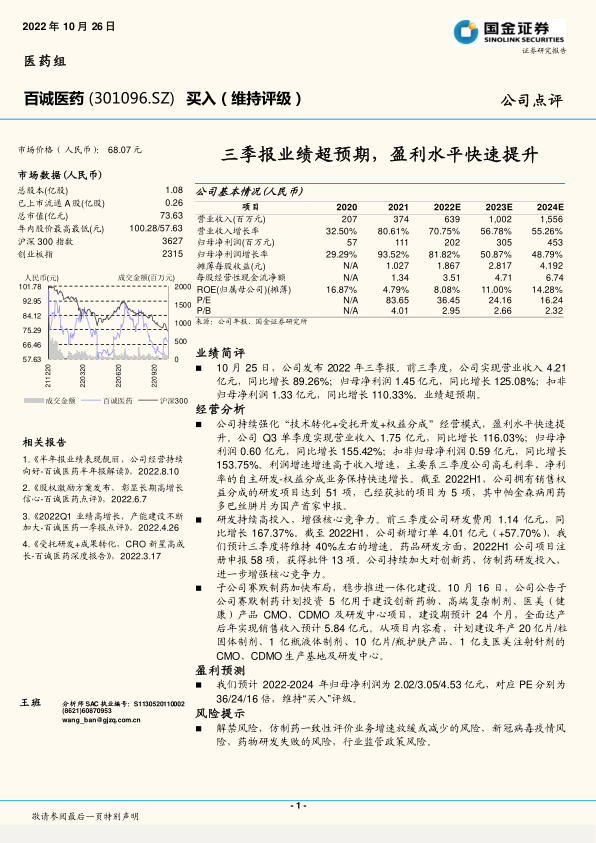 本报告分析了百诚医药2022年三季报,指出公司业绩超出预期,盈利能力快速提升,主要得益于其独特的经营模式和高毛利率业务的快速增长。公司持续加大研发投入,增强核心竞争力,同时子公司赛默制药也在积极布局,为公司未来的发展奠定基础。维持对公司“买入”评级,并预测了未来几年的盈利情况。