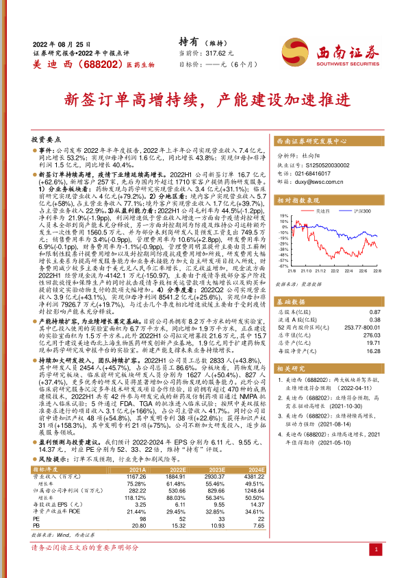 新签订单持续高增,疫情下业绩延续高增长。2022H1公司新签订单16.7亿元(+62.6%),新增客户257家,先后为国内外超过1710家客户提供药物研发服务。1)分业务板块看:药物发现与药学研究实现营业收入3.4亿元(+31.1%);临床前研究实现营业收入4亿元(+79.2%)。2)分地区看:境内客户实现营业收入5.7亿元(+58%),占主营业务收入77.1%;境外客户实现营业收入1.7亿元(+39.7%),占主营业务收入22.9%。3)从盈利能力看:2022H1公司毛利率为44.5%(-1.2pp),净利率为21.9%(-1.9pp),利润增速低于营业收入增速一方面由于疫情封控研发人员未全部到岗产能未充分释放,另一方面封控期间为防疫及维持公司运转额外发生一次性费用1560.5万元、并为部分未到岗研发人员预发工资支出749.5万元;销售费用率为3.4%(-0.9pp),管理费用率为10.6%(+2.8pp),研发费用率为6.9%(-0.1pp),财务费用率为-1.1%(-0.9pp),管理费用明显提升主要由员工薪酬和限制性股票计提费用增加以及封控期间防疫抗疫费用增加所致,研发费用大幅增长主要系为提高研发服务能力和业务承接能力加大自主研发项目投入所致,财务费用减少较多主要由于美元兑人民币汇率增长,汇兑收益增加,现金流方面2022H1经营现金流为-4142.1万元(-150.97),主要由于疫情导致部分客户阶段性回款放慢和保障生产的同时抗击疫情导致相关运营款项大幅增长以及购买和提前锁定实验动物支付的款项大幅增加。4)分季度看:2022Q2公司实现营业收入3.9亿元(+43.1%),实现归母净利润8541.2亿元(+25.6%),实现归母扣非净利润7926.7万元(+19.7%),与过去几个季度相比增速放缓主要由于受到疫情封控影响产能未充分释放。