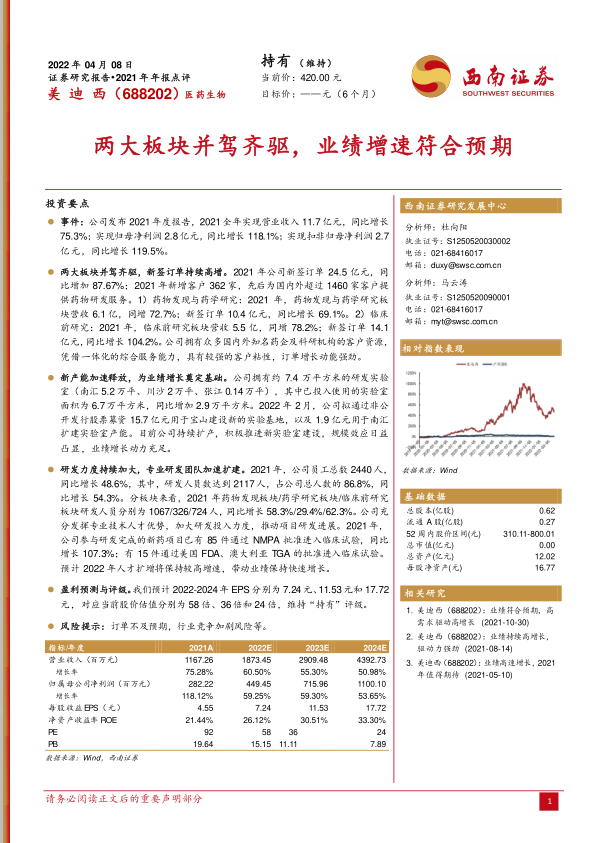 本报告分析了美迪西2021年的年报,指出公司业绩增长符合预期,两大业务板块发展均衡,新签订单持续增长。公司通过产能扩张、加大研发投入和扩建专业团队,为未来的业绩增长奠定了坚实基础。预计公司2022-2024年每股收益将持续增长,维持“持有”评级,但需关注订单不及预期、行业竞争加剧等风险。