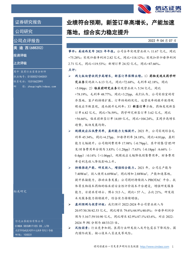美迪西2021年业绩表现强劲,营业收入和归母净利润均实现翻倍增长,新签订单额亦大幅攀升,显示出公司在药物发现、药学研究和临床前研究两大核心业务板块的卓越表现。规模效应有效降低了费用率,推动盈利能力显著提升。公司持续加大产能建设和研发投入,特别是在高精尖技术平台和人才团队方面的投资,进一步巩固了其综合实力和市场竞争力。展望未来,公司预计将继续保持高速增长态势,但需警惕行业竞争、政策变动及人才流失等潜在风险。