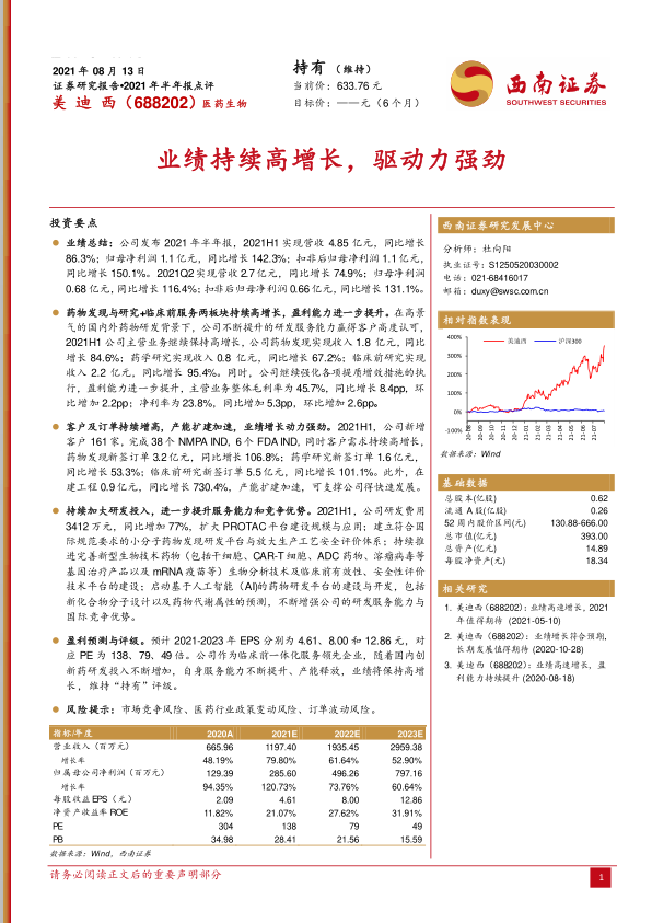 美迪西2021年上半年业绩表现出色,营收和利润均实现显著增长。公司在药物发现、药学研究和临床前研究等主营业务板块均保持强劲增长势头,盈利能力持续提升。客户及订单的持续增长、产能扩建的加速以及研发投入的加大,为公司未来的业绩增长提供了强劲动力。维持“持有”评级,并需关注市场竞争、医药行业政策变动以及订单波动等风险。