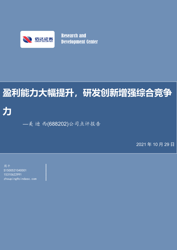 本报告分析了美迪西(688202)2021年三季报,指出公司盈利能力大幅提升,研发创新增强综合竞争力。公司前三季度营收和利润大幅增长,现金流充裕。通过加大研发投入、提升技术水平和服务能力,以及强化管理和提高运营效率,公司实现了盈利能力的显著提升。同时,公司聚焦高景气赛道,积极拓展海外业务,打造中外联动的一体化平台,增强了业务承接能力,有望保持稳健发展趋势。报告还对公司未来收入和利润进行了预测,并提示了相关风险。