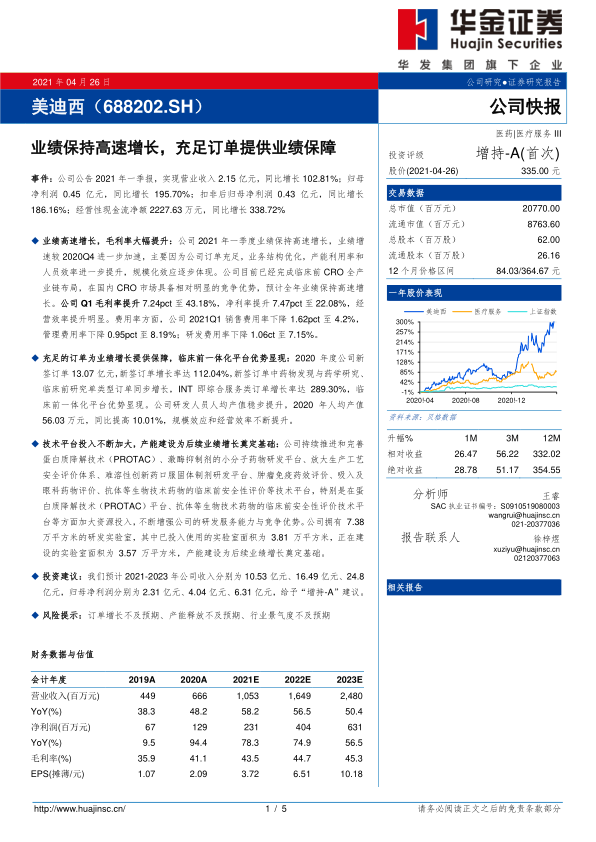 美迪西2021年一季度业绩表现亮眼,营收和净利润均实现高速增长,盈利能力显著提升。公司凭借充足的订单、临床前一体化平台优势、持续的技术平台投入和产能建设,为未来业绩增长奠定了坚实基础。华金证券给予美迪西“增持-A”的投资建议,但同时也提示了订单增长、产能释放和行业景气度等方面的风险。